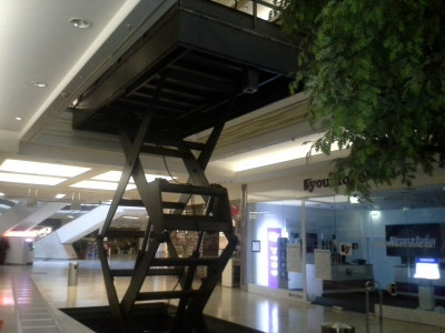 Im Untergeschoss eines Einkaufszentrums eingebaute Hebebühne, diese ermöglicht es z. B. Pkws zu Werbezwecken auf beide Ebenen zu transportieren. |